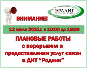 Доводим до Вашего сведения, что 12.07.2021г. с 10:00 до 16:00 (время местное) будут производиться работы по реконструкции сети ВОЛС в ДНТ «Родник».