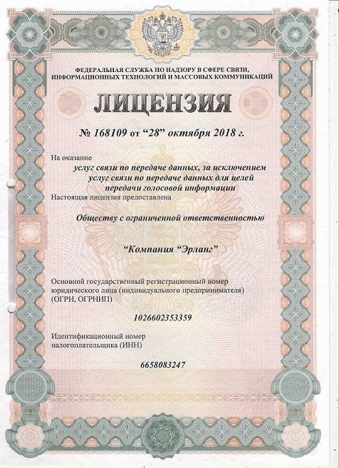 Лицензия № 168109. Услуги связи по передаче данных, за исключением услуг связи по передаче данных для целей передачи голосовой информации.