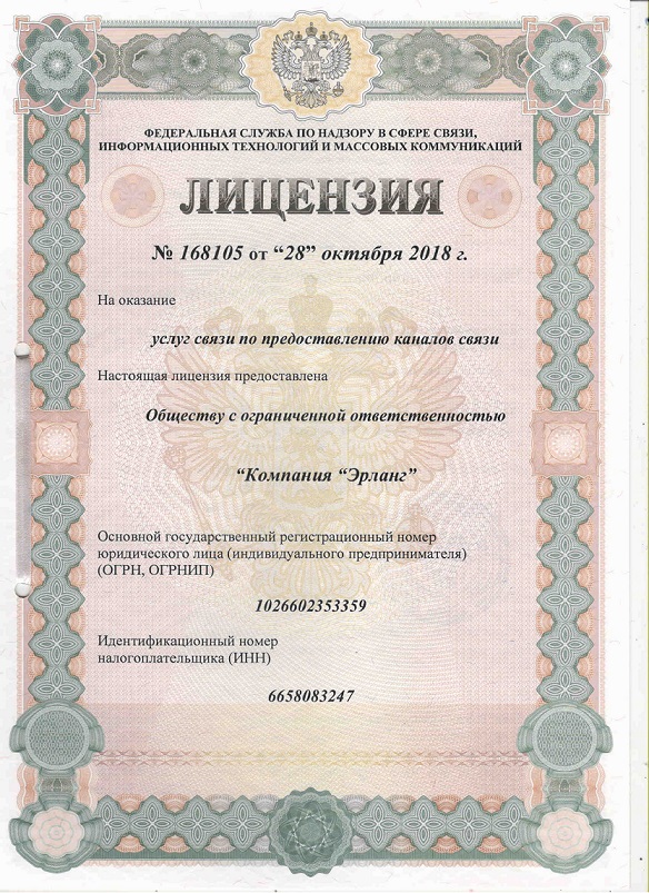 Лицензия № 168105. Услуги по предоставлению каналов связи.